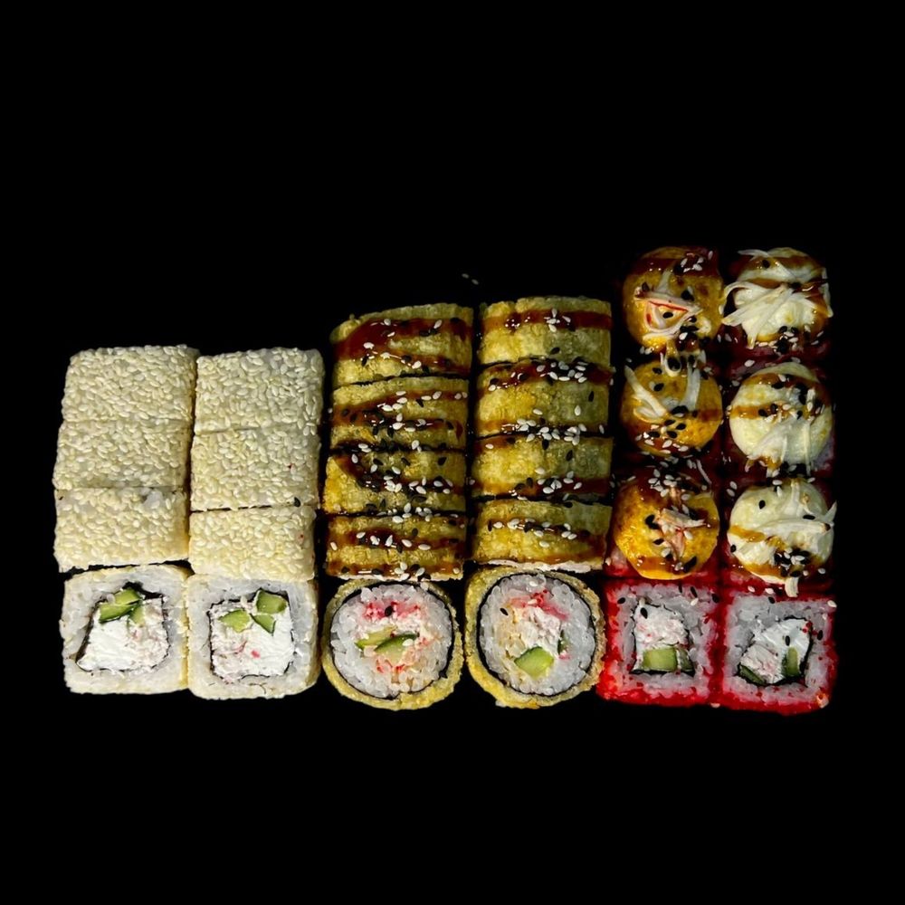 Ролл «Вулкан» запеченный. Ролл «Снежный краб». Ролл «Люксембург» жареный. Комплектацию соевого соуса и имбиря/васаби уточняйте у администратора.
