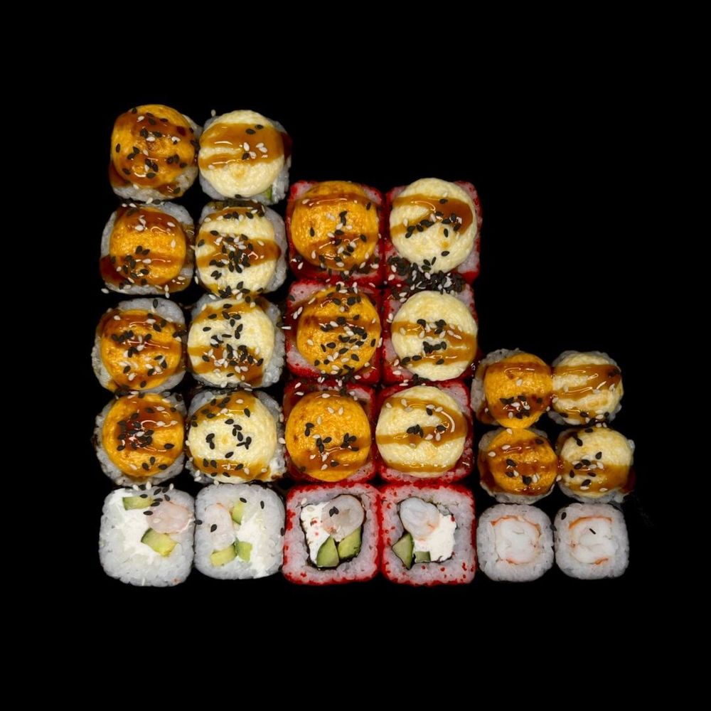 Ролл «Мак с креветкой» запеченный. Ролл « Калифорния с креветкой» запеченный. Ролл «Запеченный с креветкой». Комплектацию соевого соуса и имбиря/васаби уточняйте у администратора.