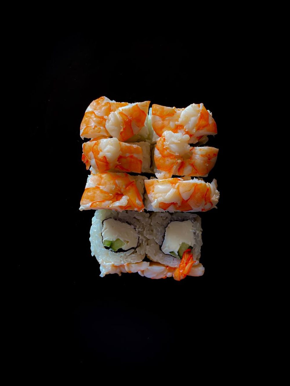 Тигровая креветка, сливочный сыр, огурец, рис, нори. Комплектацию соевого соуса и имбиря/васаби уточняйте у администратора.