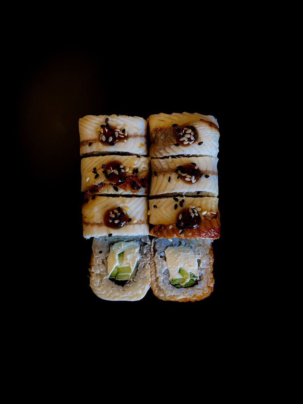 Угорь, огурец, сливочный сыр, рис, нори,соус унаги, кунжут. Комплектацию соевого соуса и имбиря/васаби уточняйте у администратора.