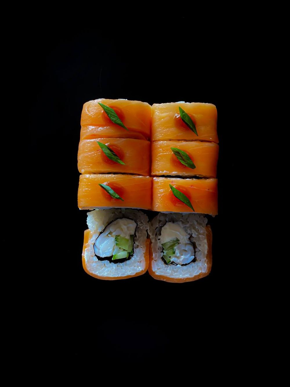 Лосось, тигровая креветка, огурец, сливочный сыр, рис, нори, соус унаги, кунжут. Комплектацию соевого соуса и имбиря/васаби уточняйте у администратора.