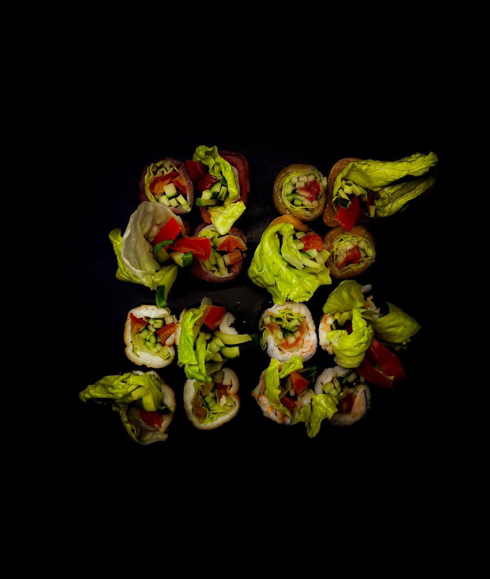 Лосось,тигровая креветка, тунец, кальмар х/к, айсберг, помидор, огурец. Комплектацию соевого соуса и имбиря/васаби уточняйте у администратора.
