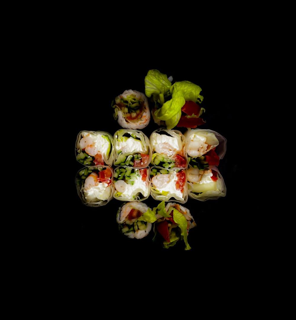 Тигровая креветка, айсберг, помидор, огурец. Комплектацию соевого соуса и имбиря/васаби уточняйте у администратора.
