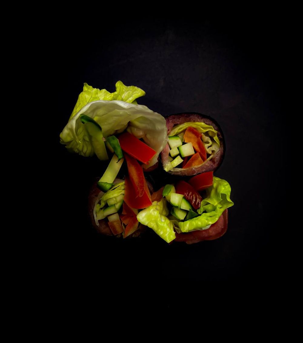 Тунец, айсберг, помидор, огурец,нори. Комплектацию соевого соуса и имбиря/васаби уточняйте у администратора.