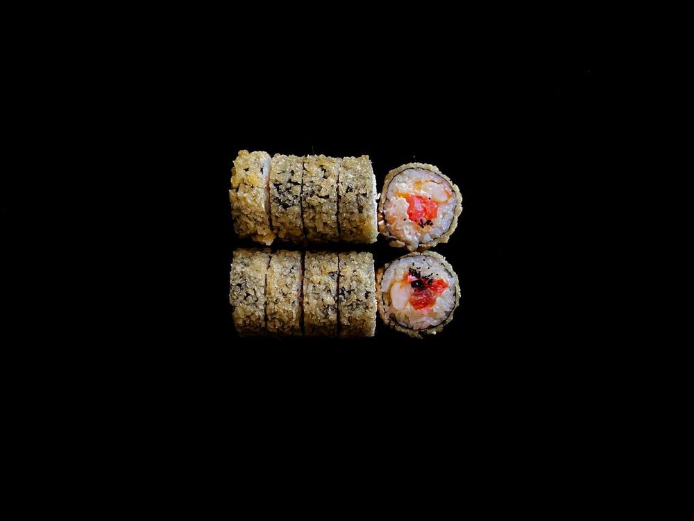 Куриное филе, огурец, помидор, сливочный сыр,рис, нори, масаго, соус терияки, кунжут, сухари панко. Комплектацию соевого соуса и имбиря/васаби уточняйте у администратора.