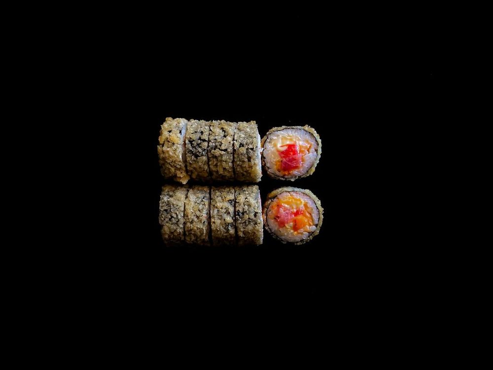 Лосось, огурец,рис, нори, масаго,соус терияки, спайси соус, кунжут, сухари панко. Комплектацию соевого соуса и имбиря/васаби уточняйте у администратора.
