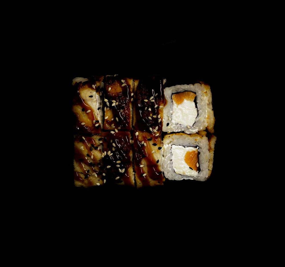 Лосось, угорь, сливочный сыр,рис, нори, соус унаги, кунжут. Комплектацию соевого соуса и имбиря/васаби уточняйте у администратора.