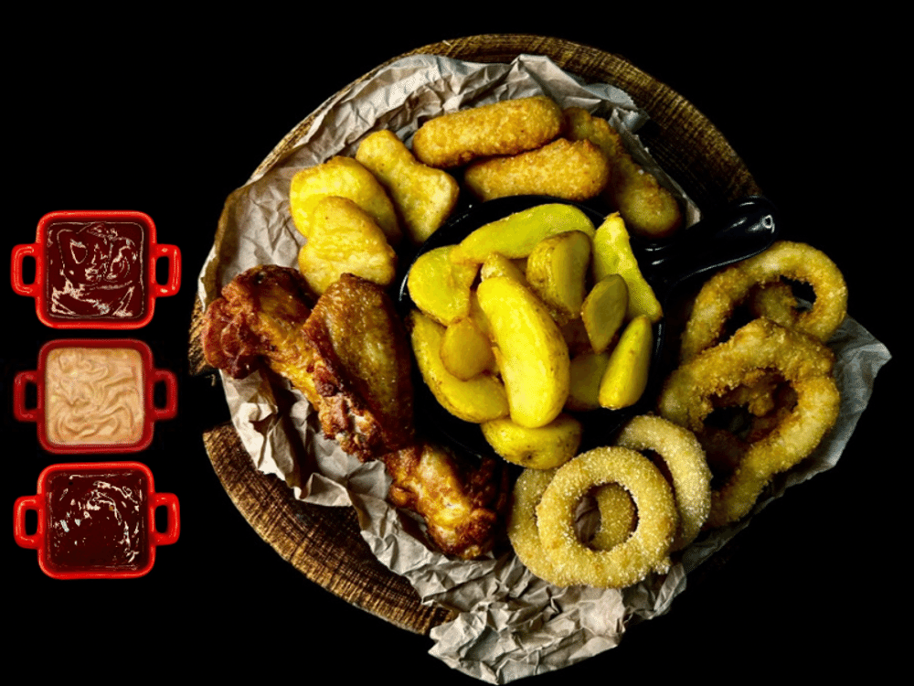 Кольца кальмара - 4 шт. Луковые кольца - 4 шт. Сырные палочки - 4 шт. Наггетсы - 4 шт. Куриные крылышки - 4 шт. Картофель по деревенски - 200 гр. Соусы 3 шт.: Кетчуп, Спайси, Сладкий Чили