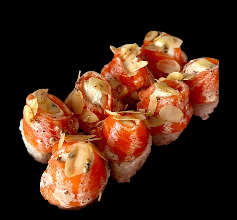 Лосось, снежный краб, лепестки миндаля, сливочный сыр, рис, нори, ореховый соус. Комплектацию соевого соуса и имбиря/васаби уточняйте у администратора.
