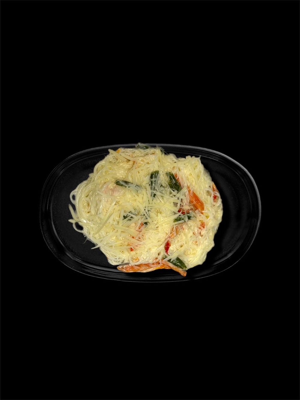 Морковь, перец, стручковая фасоль, фунчоза, крем чиз, пармезан.