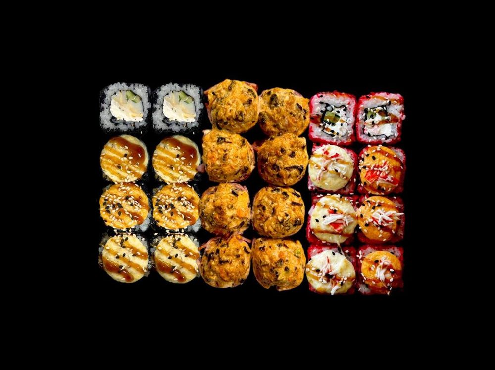 Ролл «Килиманджаро» авторский, запеченный. Ролл «Скрудж» запеченный. Ролл «Вулкан» запеченный. Комплектацию соевого соуса и имбиря/васаби уточняйте у администратора.