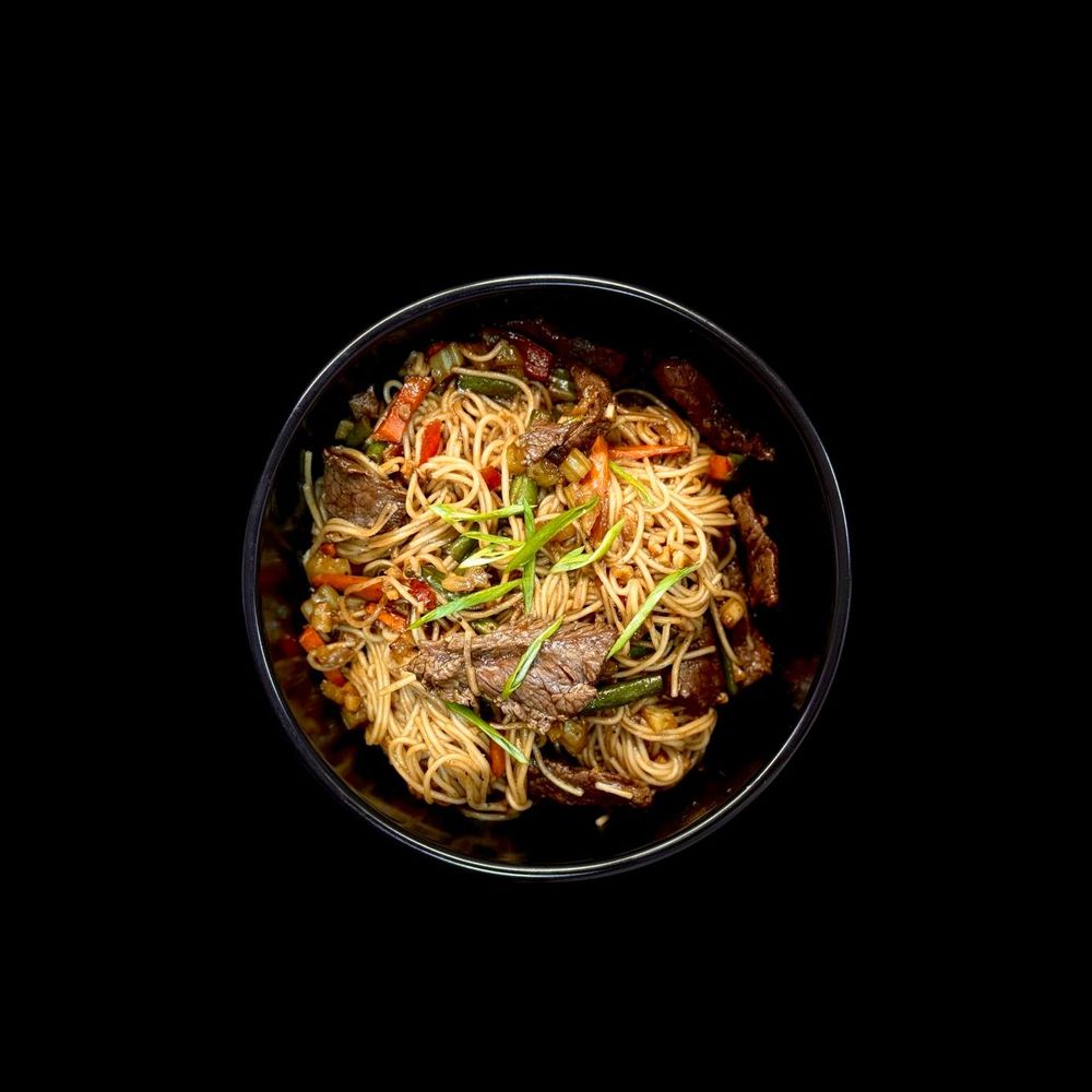 Говядина, яичная лапша, сельдерей , соус унаги , зеленый лук , морковь, стручковая фасоль, болгарский перец