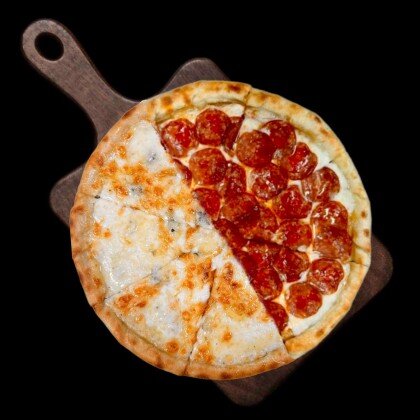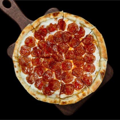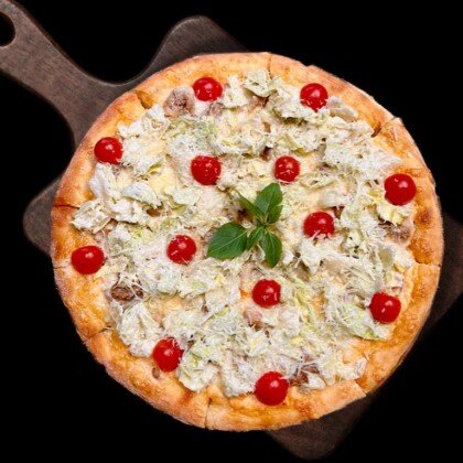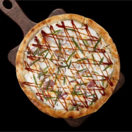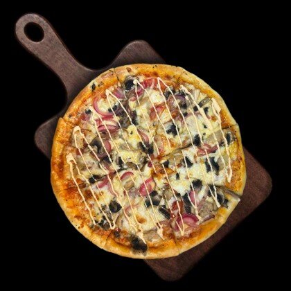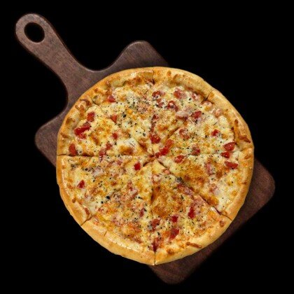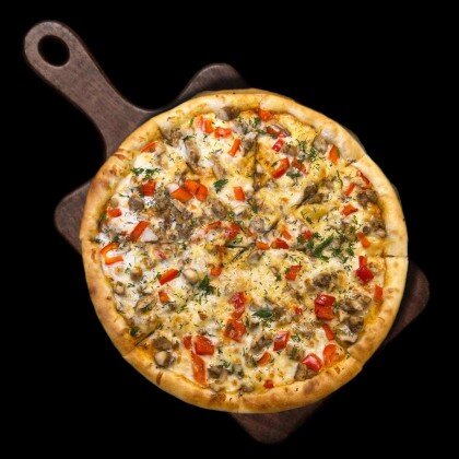 Куриное филе, охотничьи колбаски, бекон, пепперони, сыр «Моцарелла», сыр «Гауда», перец болгарский, лук красный, перец халапеньо ,соус томатный.