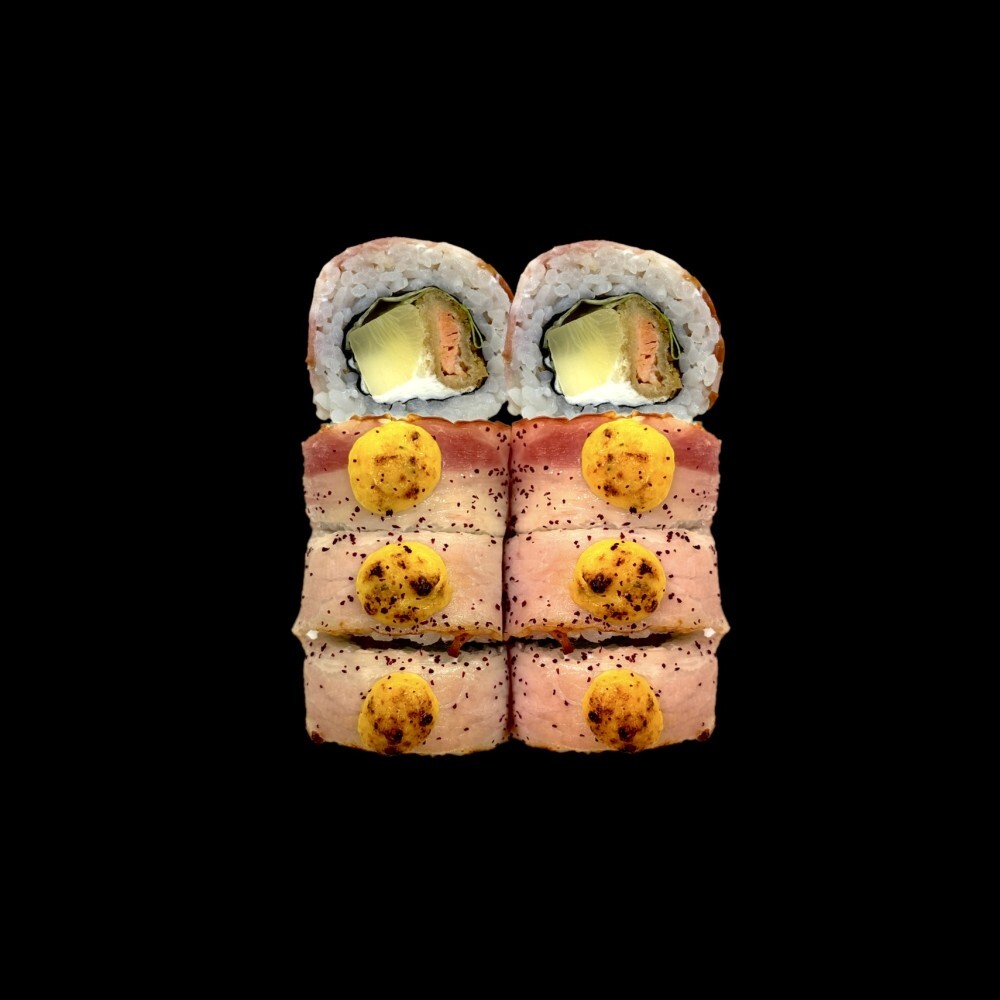 Лосось, ананас, айсберг, бекон, сливочный сыр, рис, нори, сырный соус, медово-горчичный соус, сумах