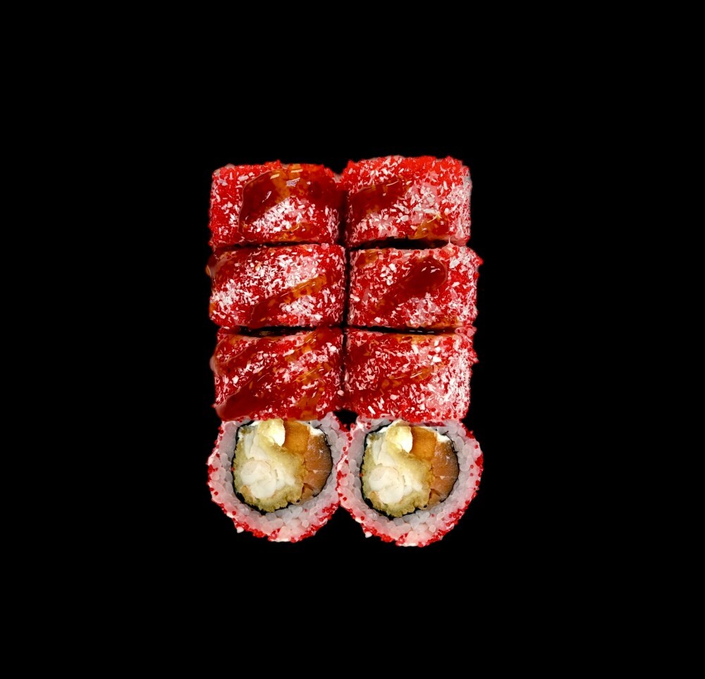 Лосось, тигровая креветка, темпура, перец болгарский, икра масаго, кокосовая стружка, рис, сливочный сыр, нори, соус сладкий чили