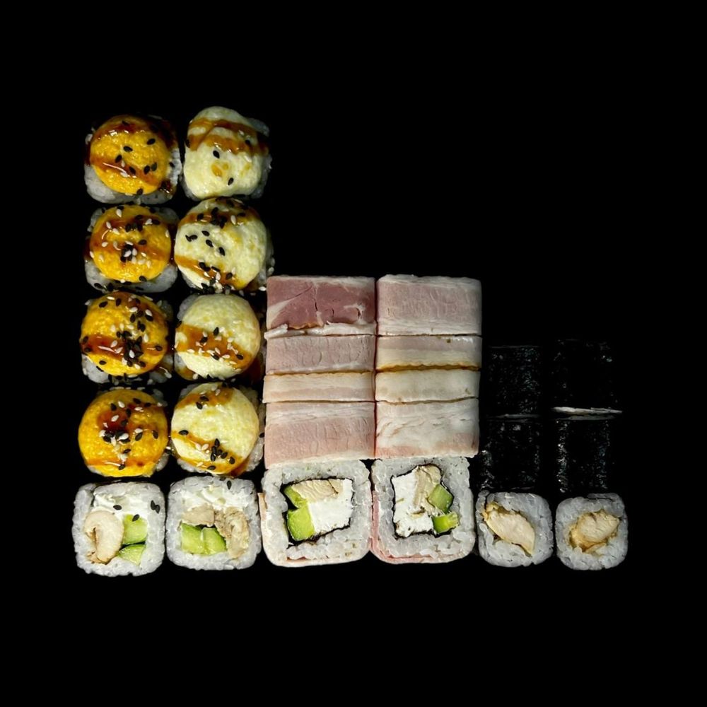 Ролл «Чибис». Ролл «Боярский» запеченный. Ролл «Мак с курицей». Комплектацию соевого соуса и имбиря/васаби уточняйте у администратора.